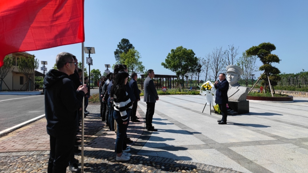 黨員們在陳士榘將軍故居前莊嚴肅立重溫入黨誓詞,表達對革命先烈的敬仰和追思,面對陳士榘將軍雕像默哀鞠躬敬獻花籃,共同緬懷他的革命精神和崇高風范。