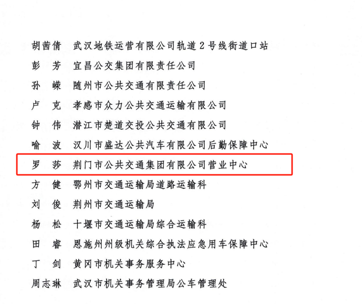 近日,交通運(yùn)輸部、公安部、國(guó)家機(jī)關(guān)事務(wù)管理局、中華全國(guó)總工會(huì)、共青團(tuán)中央聯(lián)合發(fā)出《關(guān)于表?yè)P(yáng)2023年綠色出行宣傳月和公交出行宣傳周活動(dòng)成績(jī)突出集體和個(gè)人的通報(bào)》。其中,荊門(mén)市公共交通集團(tuán)有限公司營(yíng)業(yè)中心被評(píng)為活動(dòng)成績(jī)突出集體,荊門(mén)市公共交通集團(tuán)有限公司羅莎被評(píng)為活動(dòng)成績(jī)突出個(gè)人。
