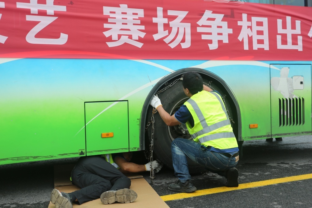 在安裝防滑鏈項(xiàng)目比武現(xiàn)場,市公交集團(tuán)汽修公司員工王剛、劉小備兩人準(zhǔn)備充分、配合默契——先由一人進(jìn)入車底檢查車況,一人拿出防滑鏈等待安裝。很快,車況檢查結(jié)束,兩人迅速將防滑鏈套上輪胎,并將防滑鏈上的橡皮繩捆扎成規(guī)則五角形,經(jīng)檢查內(nèi)外側(cè)松度并無明顯松垮現(xiàn)象后,以3分09秒的成績結(jié)束比賽。