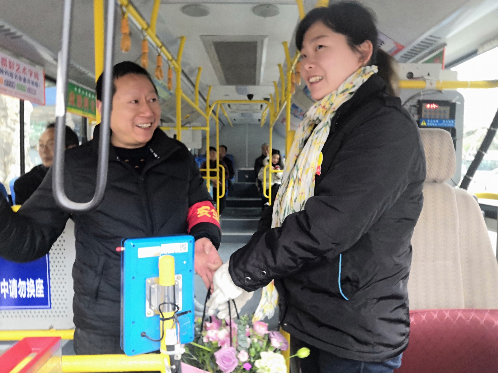 “我代表公司全體男職工,祝你們節(jié)日快樂(lè),永遠(yuǎn)美麗??!這籃鮮花送給你~”公交信息技術(shù)部男職工羅皓這樣說(shuō)道,并將一籃鮮花送到正在跑班的公交女駕駛員蘇純菊手中。面對(duì)這突來(lái)的鮮花和祝福,蘇純菊滿臉驚喜和溫馨,“謝謝,謝謝你們”在道謝聲中,關(guān)上車門,微笑著駛向下一站。