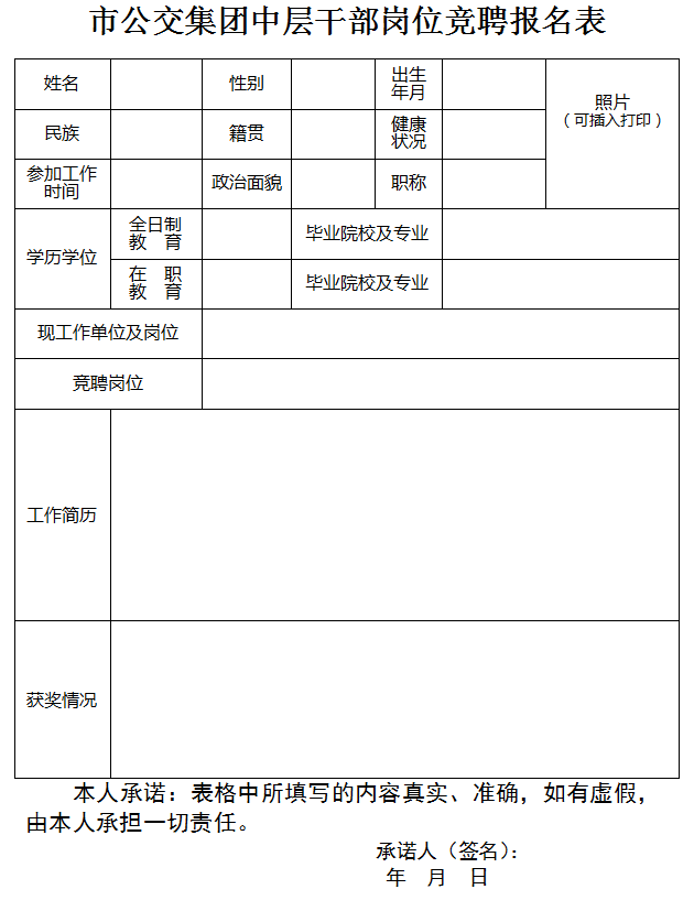2.報名方式為現(xiàn)場、網上兩種方式。可登陸荊門市公共交通集團有限公司網站,下載《市公交集團中層干部崗位競聘報名表》并填寫,